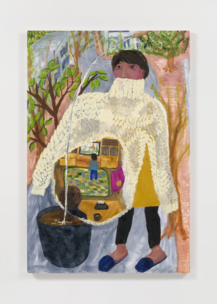 Realms touch without becoming enmeshed, sometimes carved out, divided on the canvas itself. A private glimpse of home is cradled inside a sweater; a woman cycles across a witnessed event and its imagined future repercussions, embodying an experience that is not fully hers. Tenderness and trauma are both banal, unfolding in amorphous scenes. One might be tempted to call the works vignettes. Idetsu’s unaffected, syncopated musings on each work evoke a parable, but one without moral resolution…