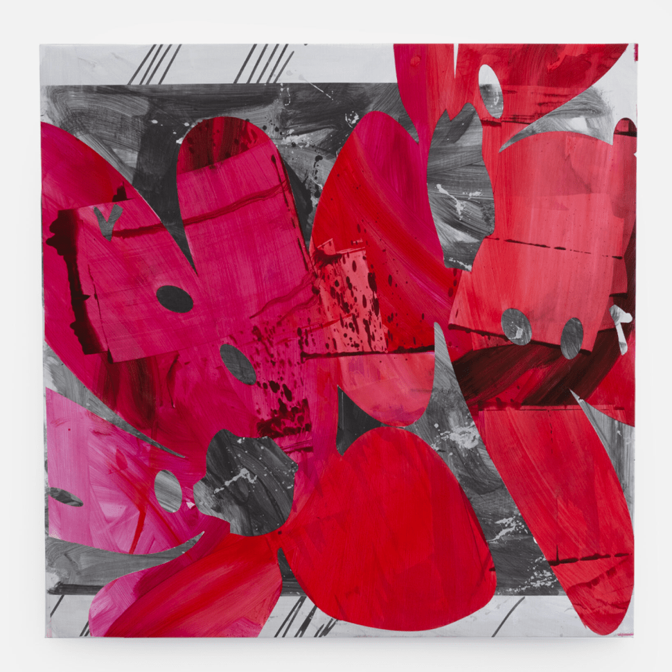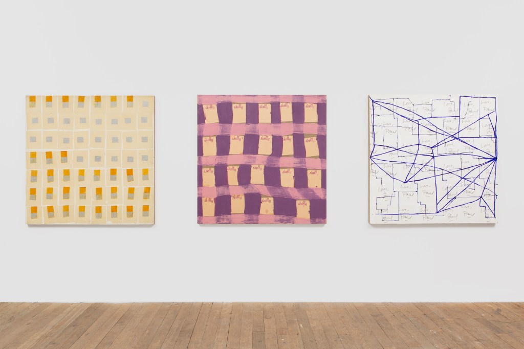 Joss paper, notepaper, laser prints, oil on linen, Triptych, each: 42 × 42 in. (106.68 × 106.68 cm). Photo: Gregory Carideo. Image courtesy the artist and Bridget Donahue, NYC.